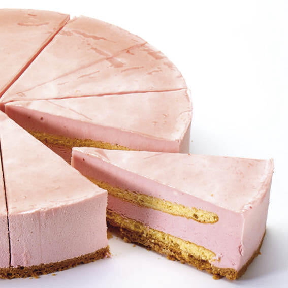 De populaire variant aardbeien-bavarois op een koekjesdeeg bodem, in combinatie met moscovische cake en afgewerkt met een glimmende spiegel van aardbeien gelei. Een geliefd product, voorgesneden in 12 punten, dat zeker in de smaak valt bij velen.