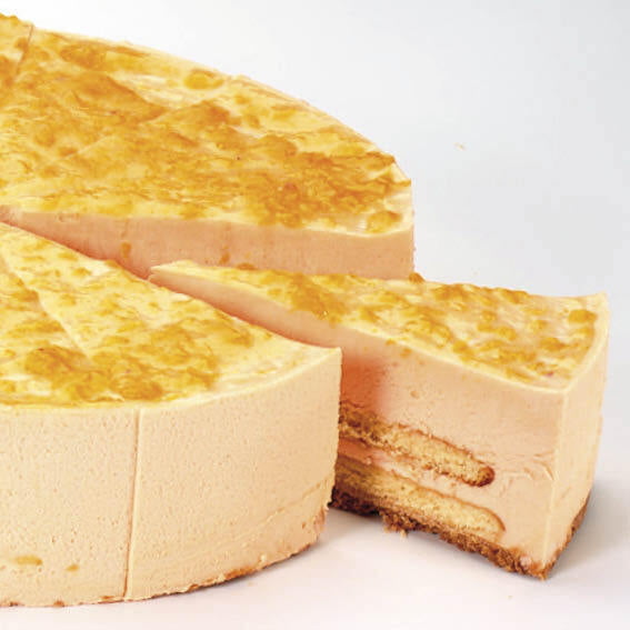 De bavarois Sinassappel taart is een verrassende afwisseling in het bavarois assortiment. Deze variant is gegoten op een luchtige kapselbodem, in combinatie met moscovische cake en afgewerkt met een gladde spiegel van mandarijnen gelei. Een nieuwe variatie, voorgesneden in 12 punten die ervoor zorgt dat u uw klant weer eens kan verrassen met iets nieuws.
